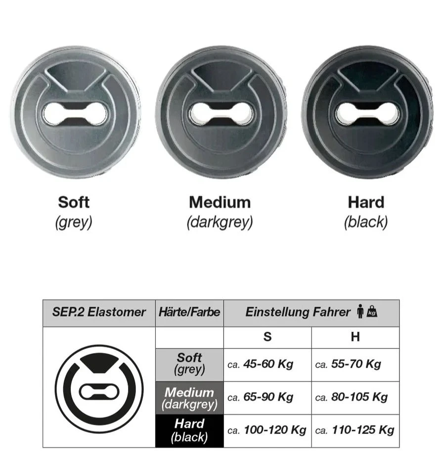 La tige de selle à ressort bySchulz parallélogramme SEP.2 absorbe efficacement les chocs grâce au mécanisme précis du parallélogramme et à l’élément de ressort en élastomère. Celui-ci est disponible en trois degrés de dureté (doux, moyen, dur) et est choisi en fonction du poids du corps. De plus, le degré de dureté peut être ajusté encore plus finement, directement au niveau de l’œil central inséré. La tige de selle à ressort en parallélogramme est adaptée individuellement à vos besoins et vous roulez avec un confort maximal.