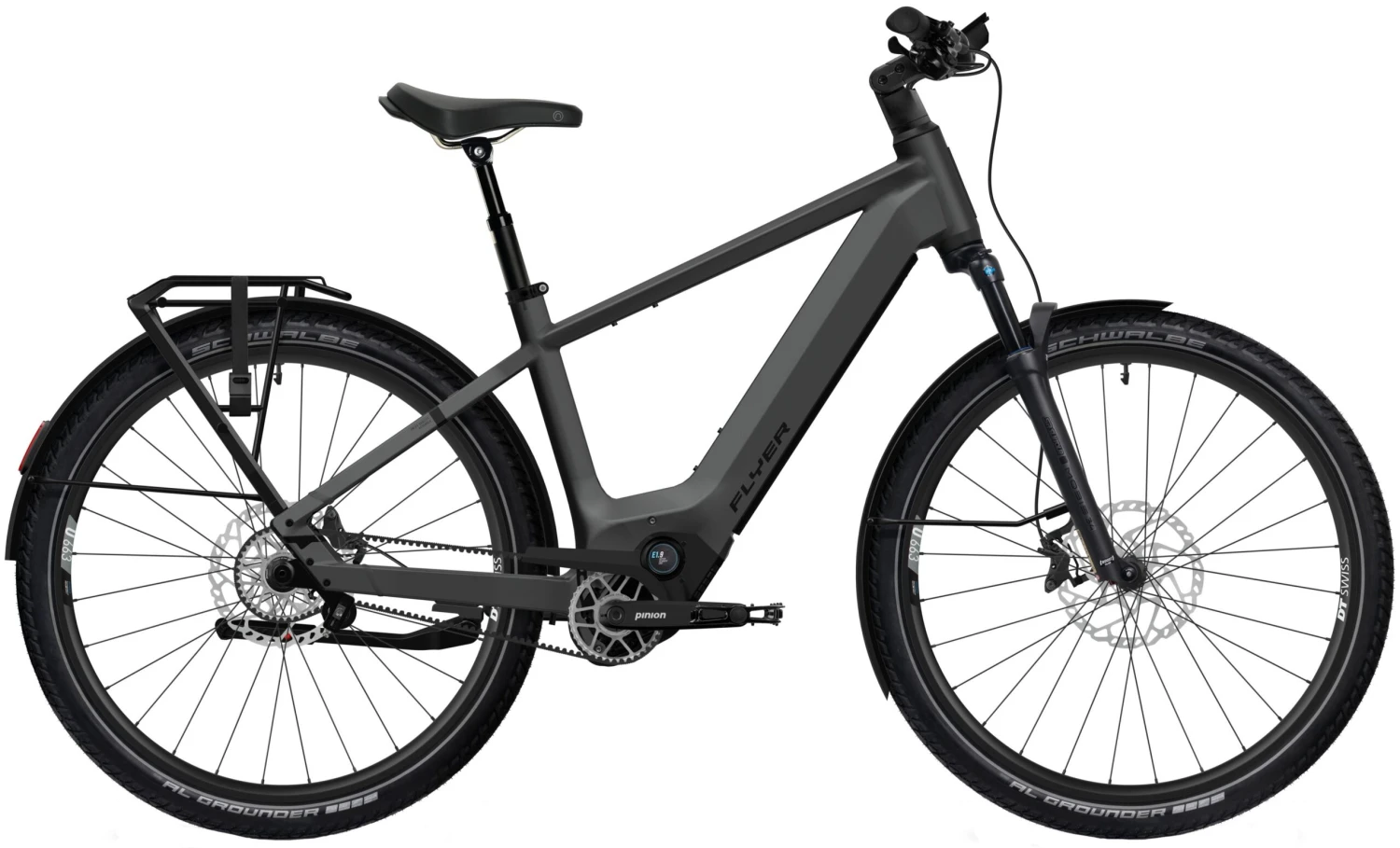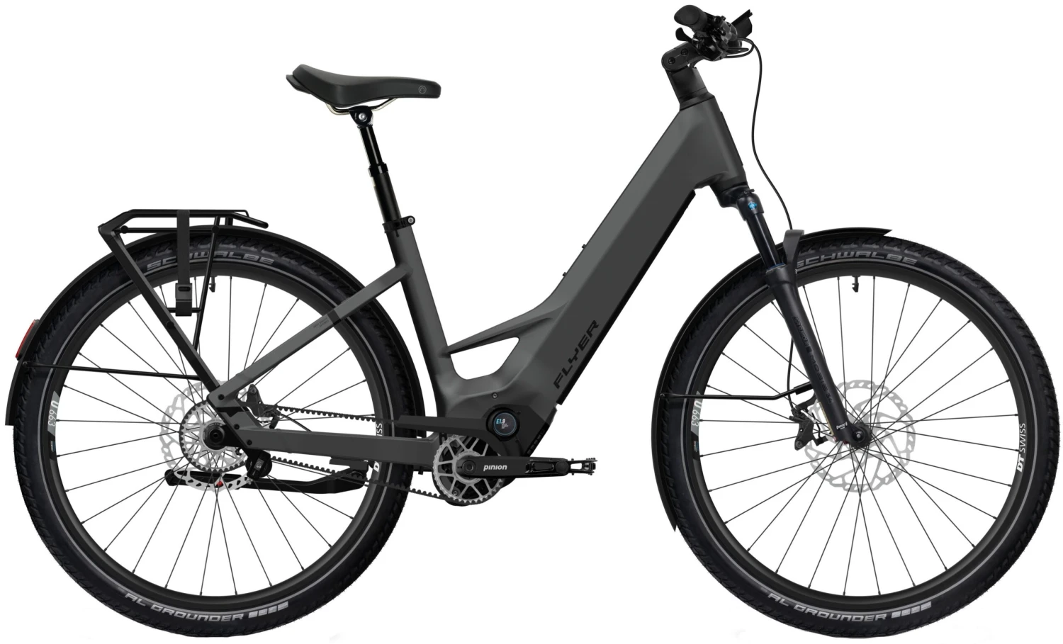 Le Flyer Goroc TR 7.33 2026 est votre compagnon idéal pour les longues randonnées et les trajets quotidiens. Ce vélo électrique de randonnée est équipé d’une puissante batterie FIT TubePack 800Wh. Pour les trajets plus courts, elle peut être utilisée plusieurs jours sans être rechargée. Si l’état de la batterie s’avère insuffisant, il suffit de la recharger en peu de temps avec le chargeur FIT Fast Charger 5A. Le moteur est le Pinion E1.9 MGU. Il s’agit d’une innovation tout-en-un qui réunit le moteur, la boîte de vitesses et le changement de vitesse électronique. Avec la transmission par courroie, l’unité moteur-boîtier (MGU) garantit une expérience de conduite agréable et nécessitant peu d’entretien. La commande s’effectue via l’unité de commande FIT Remote Basic -Shift. Elle permet de commander le FIT Display Compact, qui permet de visualiser le niveau d’assistance actuel, l’autonomie parcourue et l’état de la batterie pendant le trajet.