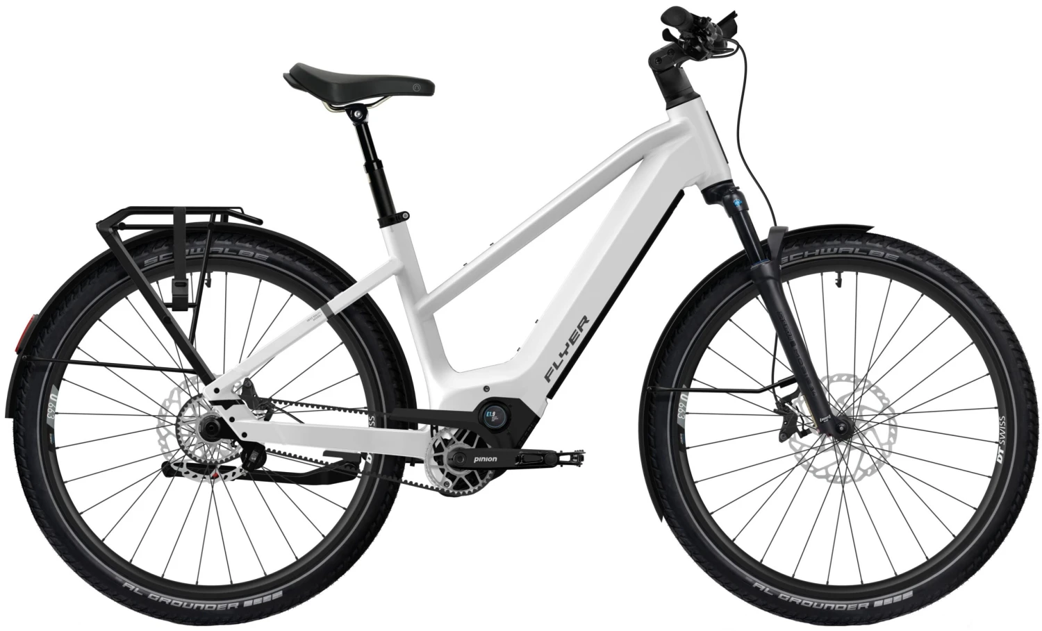 Année modèle: 2026 Type de vélo électrique: VTC électriques, Vélo de ville électrique Forme du cadre: Cadre bas / vague, Femme / Trapèze, Homme Fabricant: Flyer Capacité de la batterie: 800 Wh – 899 Wh Dérailleur/type de transmission: Moyeu à vitesses intégrées – courroie Nombre de vitesses: 9-vitesses Système d’entraînement: Moteur Pinion Position de la batterie: Batterie Intube / intégrée Moteur Pinion: Pinion E1.9 MGU Cadre: Hommes, femmes, cadre bas Fourche: SR Suntour Mobie34 Air | 100mm, 15 × 100mm Batterie: FIT TubePack 800 | 800 Wh, 15 Ah, 48 V Dérailleur: Pinion E1.9 MGU | 9 vitesses, Gates Carbon Drive CDX, Comfort Setup Pneus: Schwalbe Johnny Watts | 29 × 2.35 (60 – 622) Selle: Selle Royal On Plus Moderate Wide Tige de selle: Suspension Satori Xopic2 | 31,6 mm Porte-bagages: FLYER ONE Sport Rack II | compatible avec MonkeyLoad Cadenas: Serrure de batterie Abus XPlus | avec système OneKey Article: Flyer Goroc TR 7.33 – 2025 Coloris: Pearl White Satin | Black Shading Satin Phare: FLYER ONE HL-2 | 100 Lux, avec Feux de circulation diurne à LED automatiques Potence: FLYER Alliage | 31.8 × 95mm, angle réglable Ecran: FIT Display Compact DSP1-M | Écran couleur de 2 pouces Béquille latérale: Ursus Mooi+ U-Mount Garde-boue: HEBIE Alumee FLYER Design | 72 mm Materiau: Aluminium Moteur: Pinion E1.9 MGU Eclairage arrière: FLYER RL-2 Taille de la roue: 29″ Guidon: Humpert Ergo XXL | 700 mm Poids total autorisé: 150 kg Chargeur: FIT Fast Charger 5A 48V Poids de l’article: sans batterie : 21,9kg | avec batterie : 26,2kg Taille: S, M, L, XL Unité de commande: FIT Remote Basic e-Shift Frein: Shimano BR-MT420 & BL-M4100 | 4 pistons