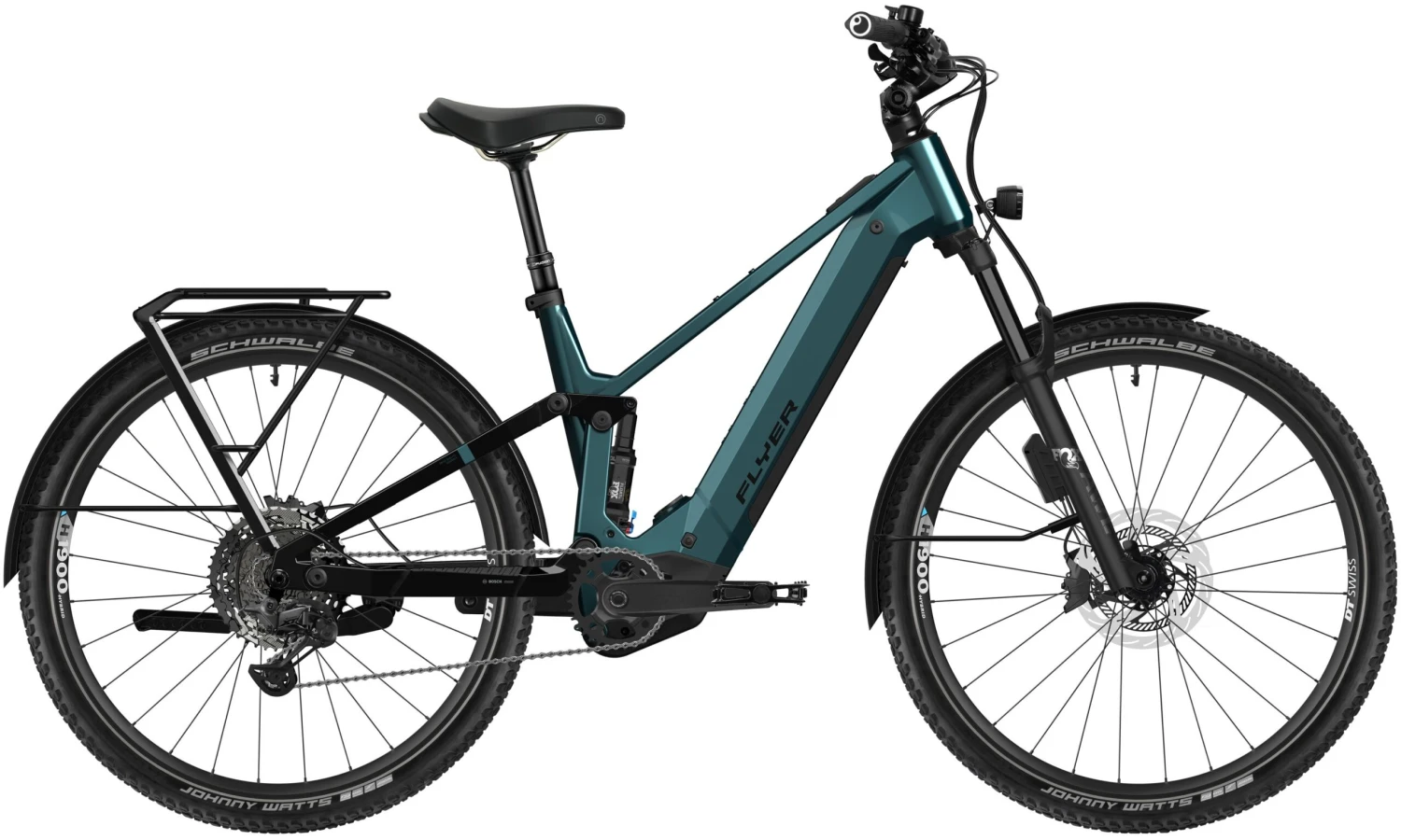 Année modèle: 2026 Type de vélo électrique: VTC électriques, VTTAE XC Système d’entraînement: Moteur Bosch Fabricant: Flyer Capacité de la batterie: 800 Wh – 899 Wh Dérailleur/type de transmission: Dérailleur – chaîne Nombre de vitesses: 11-vitesses Position de la batterie: Batterie Intube / intégrée Moteur Bosch: Bosch Performance Line CX à partir de 2025 Smart System Fourche: Fox AWL HD 140mm | 15 × 110mm Batterie: Bosch PowerTube 800 | 800Wh, 22.2Ah, 36V Dérailleur: Shimano XT Linkglide | 11 vitesses, 11 – 50t, dérailleur Pneus: XS-S : Schwalbe Johnny Watts 27.5 × 2.35 (60- 584) | M-XL : Schwalbe Johnny Watts 29 × 2.35 (60- 622) Freins: Magura Gustav Pro ABS | 4 pistons Selle: Selle Royal ON modéré Tige de selle: XS : X-Fusion Manic Dropper Post 100mm | S-XL : X-Fusion Manic Dropper Post 125mm Porte-bagages: FLYER ONE Sport Rack, avec clapet à ressort (compatible avec MonkeyLoad) Article: Flyer Goroc X 6.70 – 2026 Coloris: Jasper Green Gloss Phare: FLYER ONE HL-2, 100 Lux | avec Feux de circulation diurne à LED automatiques Potence: Ergotec Integra Performance Vario, 80mm Ecran: Bosch Kiox 500 Béquille latérale: Ursus Mooi+ U-Mount Compatibilité: Application Bosch eBike Flow Amortisseur: Fox Float Performance | 190×45mm Référence du fabricant: 175876 Garde-boue: HEBIE Alumee FLYER Design, 72mm Materiau: Aluminium Assistance: jusqu’à 25 km/h Moteur: Bosch eBike Smart System Performance Line CX Niveaux d’assistance: ECO | TOUR+ | SPORT | TURBO Eclairage arrière: FLYER RL-2 Taille de la roue: XS-S : 27,5″ | M-XL : 29 Guidon: Ergotec Riser Bar 30 Comfort | 780mm, 16°, 30mm Poids total autorisé: 150 kg Chargeur: Bosch eBike chargeur standard 4A Batterie additionnelle: Bosch PowerMore 250Wh (non inclus dans la livraison !) Taille: XS, S, M, L. XL Collier de guidon: 31,8 mm EAN: 10313-001 : 8720602316782 | 10313-002 : 8720602316799 | 10313-003 : 8720602316805 | 10313-004 : 8720602316812 | 10313-005 : 8720602316829 Unité de commande: Bosch System Controller & Mini Remote Bosch E-Bike System: Bosch eBike Smart System