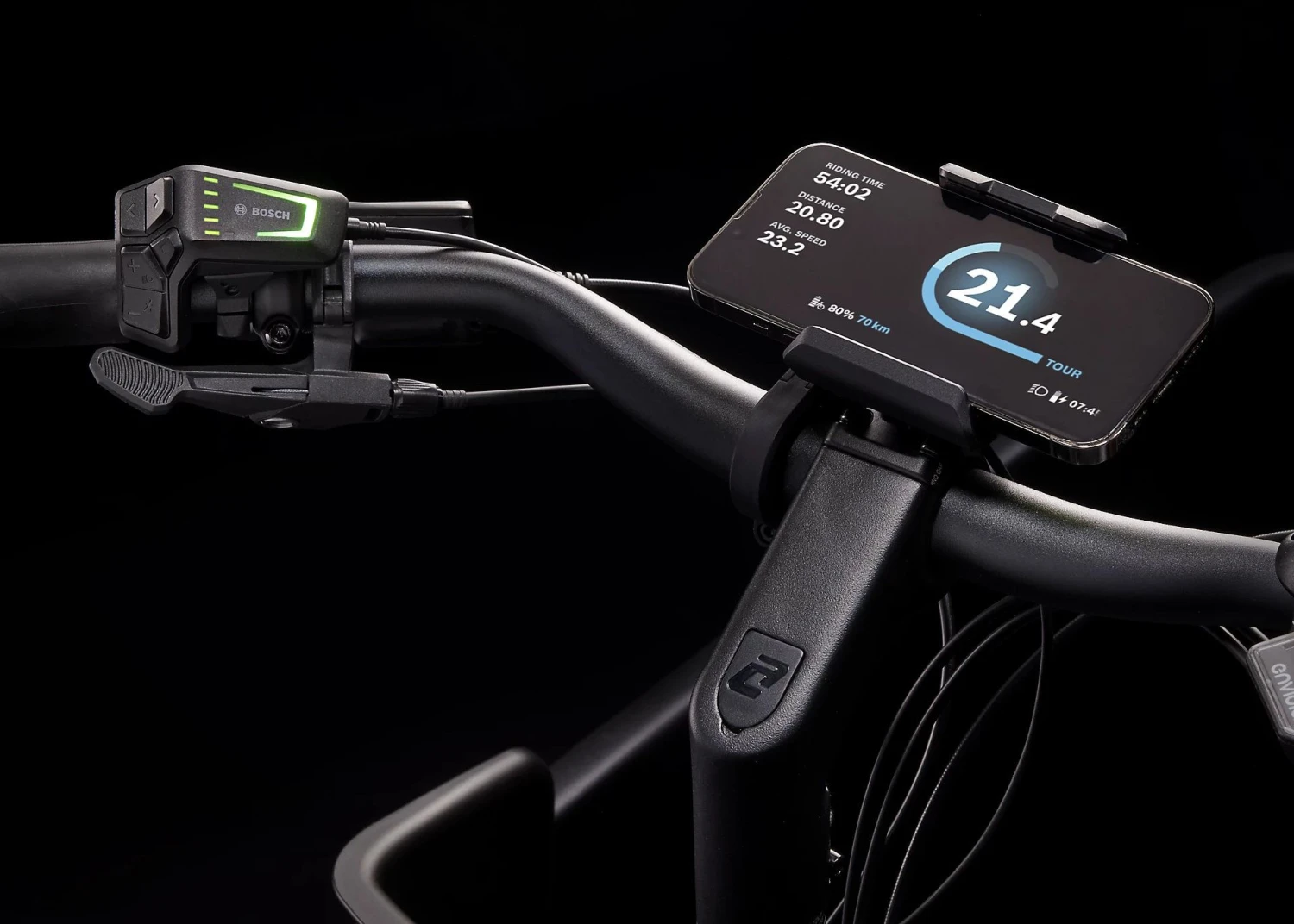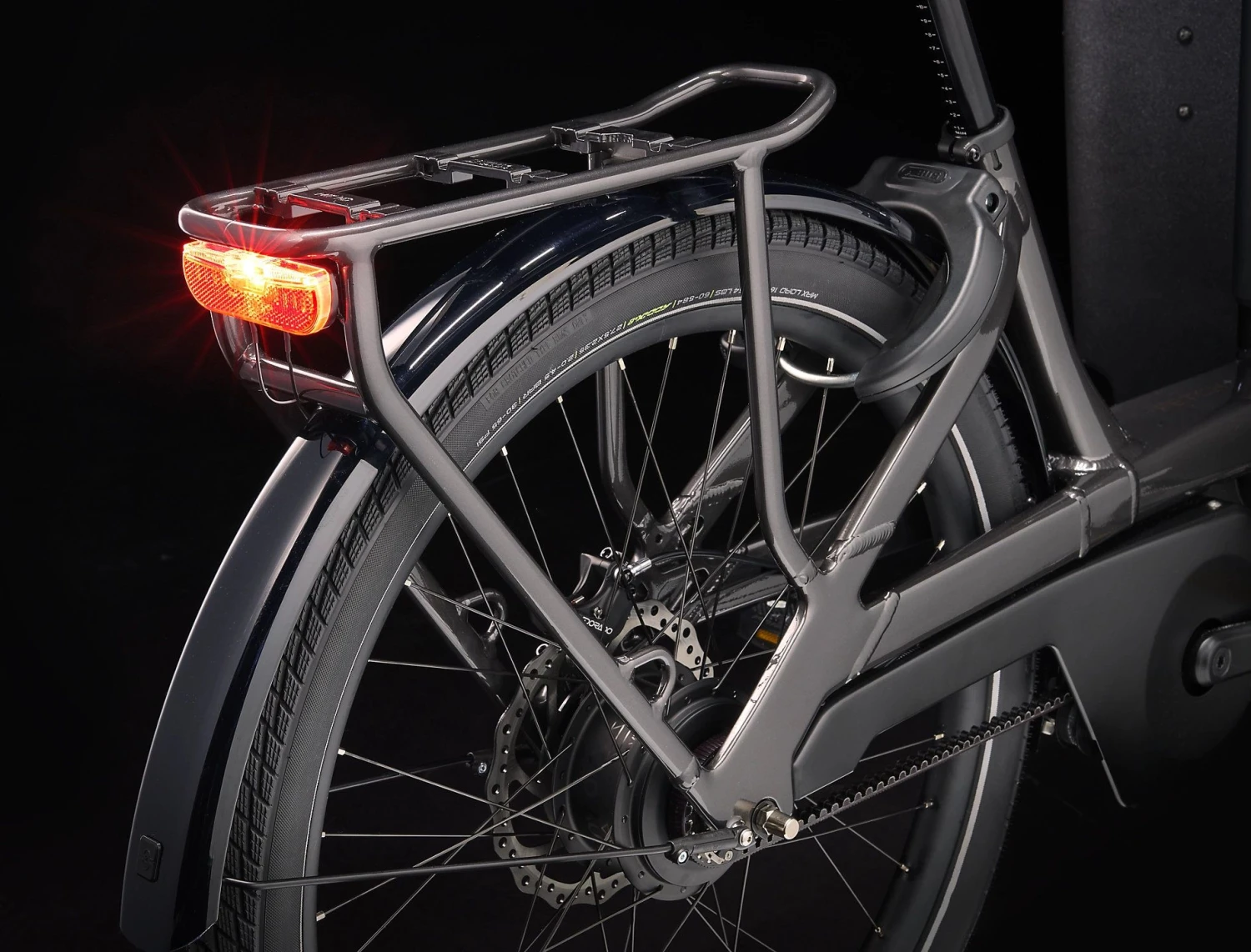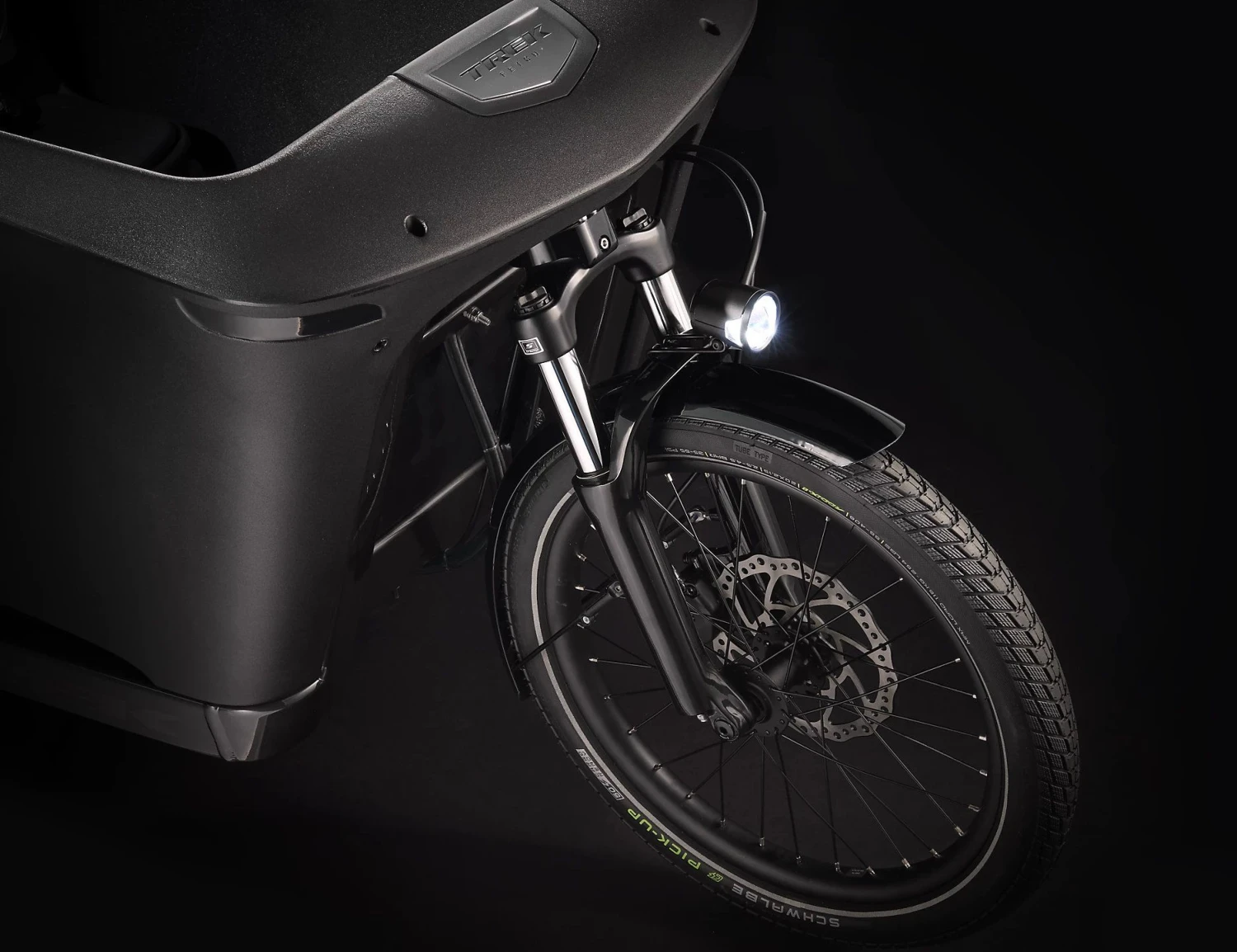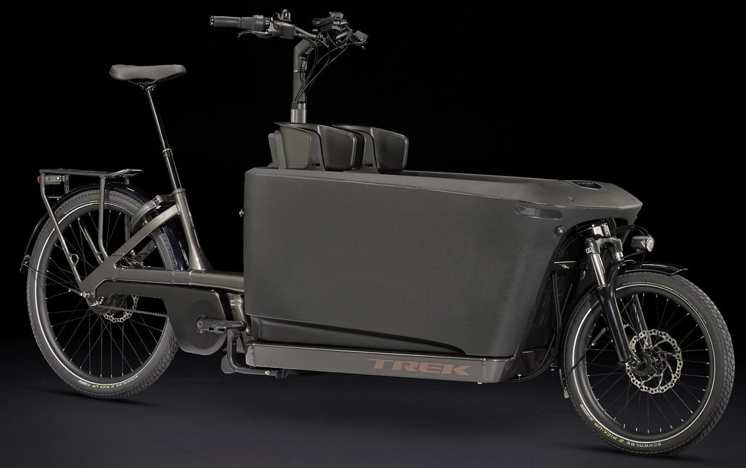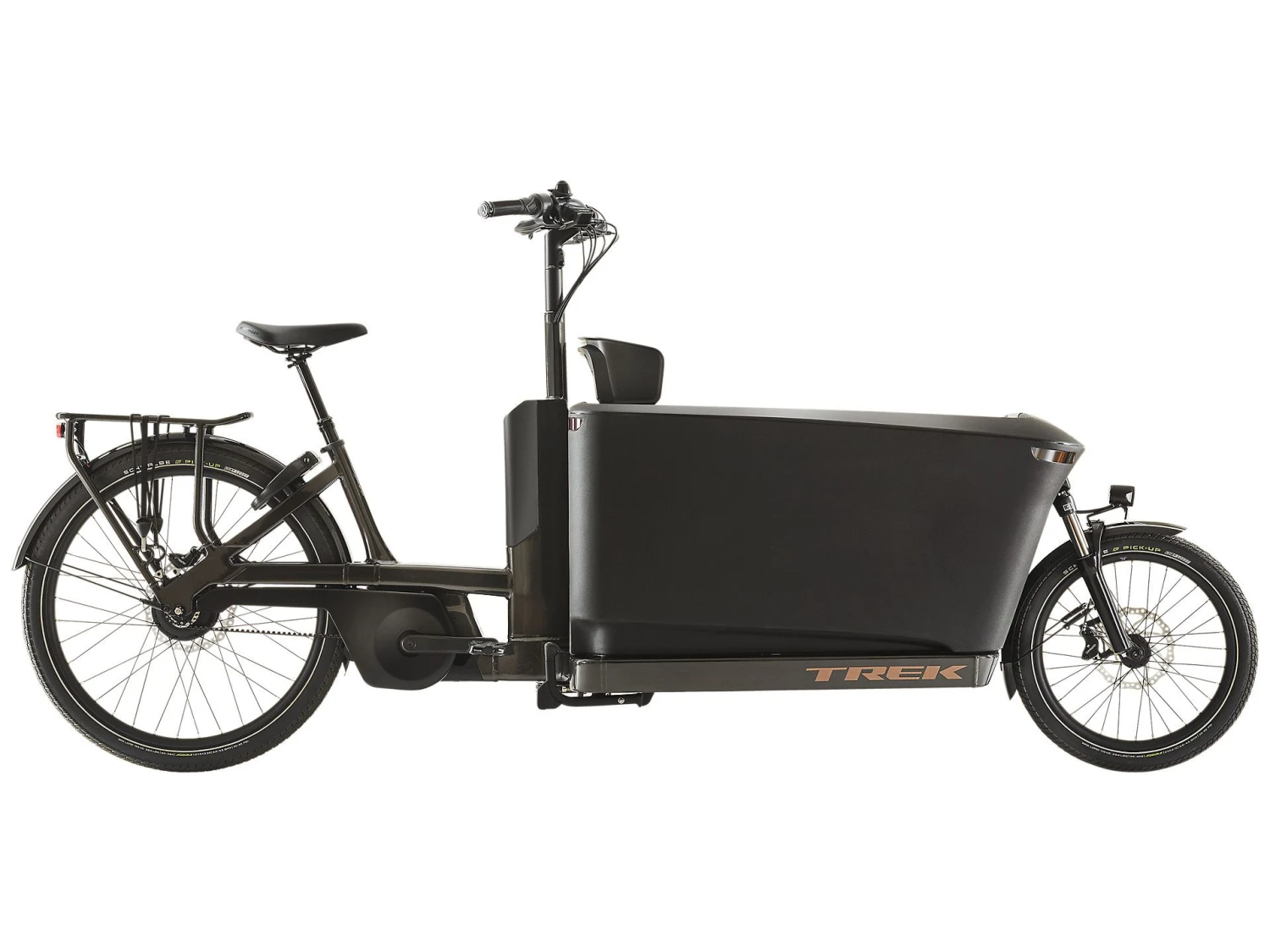 Année modèle: 2026 Type de vélo électrique: Vélos cargo et vélos utilitaires Système d’entraînement: Moteur Bosch Fabricant: Trek Capacité de la batterie: 700 Wh – 799 Wh Moteur Bosch: Bosch Cargo Line à partir de 2022 Smart System Cadre: Cadre en aluminium haute performance avec tubes hydroformés, design lowstep, batterie intégrée amovible, passage des câbles interne, Motor Armor, fixation des freins à disque Post Mount, axe traversant 148×12 mm Batterie: Bosch PowerTube 750 Wh, système intelligent Pneus: Schwalbe Pick-Up, Addix E-Compound, conforme à ECE-R75, tringle à fils, 20×2,35″ // Schwalbe Pick-Up, réfléchissant, tringle à fils, Super Defense Carcass Construction, 60-584 Selle: Bontrager Boulevard Tige de selle: TranzX JD-YSP28PLQ, course de 200 mm, guidage interne du câble, 31,6 mm Poids: 75 kg Suspension avant: SR Suntour Mobie A32, 50mm de débattement Potence: Bontrager, aluminium, diamètre de serrage 31,8 mm, 35 degrés, longueur 90 mm Garde-boue: Trek Fetch Custom Plateau: Gates CDX, 50 dents Poignées: Bontrager Satellite Elite, collier de serrage en aluminium Moteur: Bosch Cargo Line, Smart System, boîtier moteur en magnésium, 85 Nm Eclairage arrière: Trelock LS614 avec feu de stop Eclairage avant: Herrmans MR8e, 180 lumens, 60 lux Pedales: Pédales de ville Bontrager Moyeu avant: Formula DC-71, aluminium, roulements étanches, fixation de disque 6 trous, axe traversant 15 x 100 mm Guidon: aluminium, serrage de 31,8 mm, hauteur de 25 mm, largeur de 630 mm Manivelle: ProWheel, aluminium, longueur de manivelle 170 mm Cassette: Gates CDX, 22 dents, acier Levier de vitesse: Enviolo Pro, poignée tournante de changement de vitesse manuelle avec affichage Chargeur: Chargeur standard Bosch 4 A, 230 V, Smart System Béquille: Béquille Fetch Custom Disque de frein: Tektro Wave, 6 trous, 180 mm Unité de commande: Bosch BSP3200 SmartPhone Grip Frein: Frein à disque hydraulique à 4 pistons HD-T737 charge maximale: 250 kg (vélo, conducteur, charge utile)
