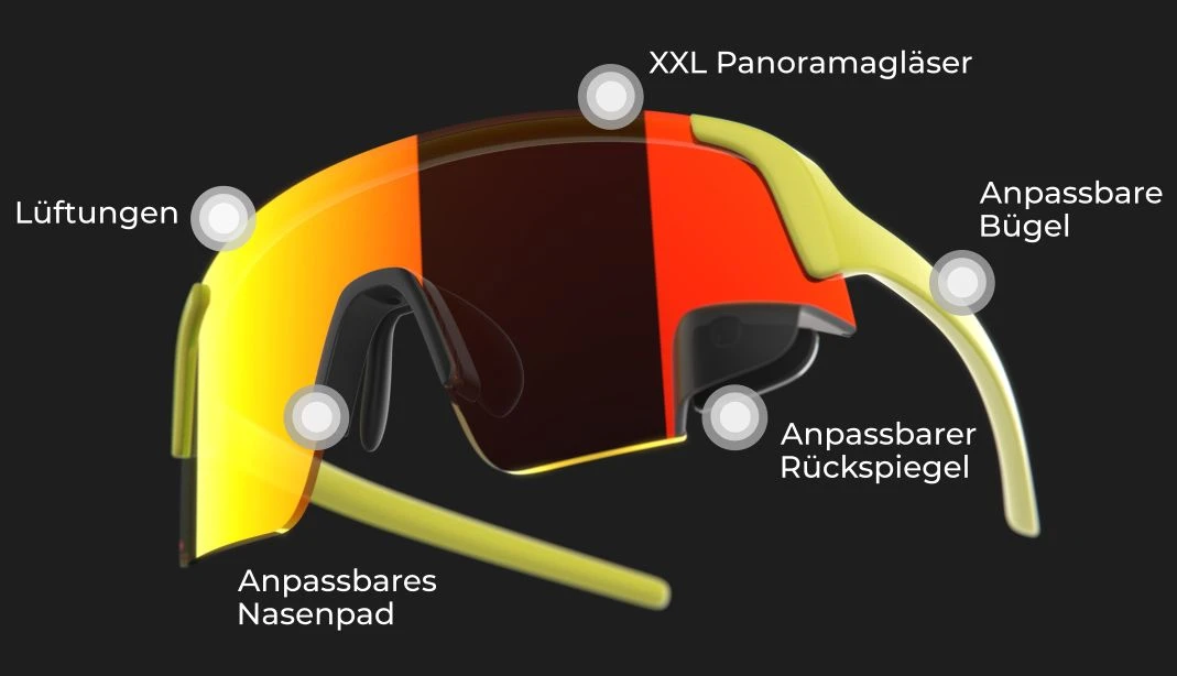 - Verres HD améliorant le contraste : les verres HD offrent non seulement une vision claire vers l’arrière, mais aussi un contraste optimal et une protection vers l’avant. Détectez à temps les irrégularités du sol, les racines et les nids de poule, tandis que les verres XXL choient vos yeux avec la meilleure protection UV400.